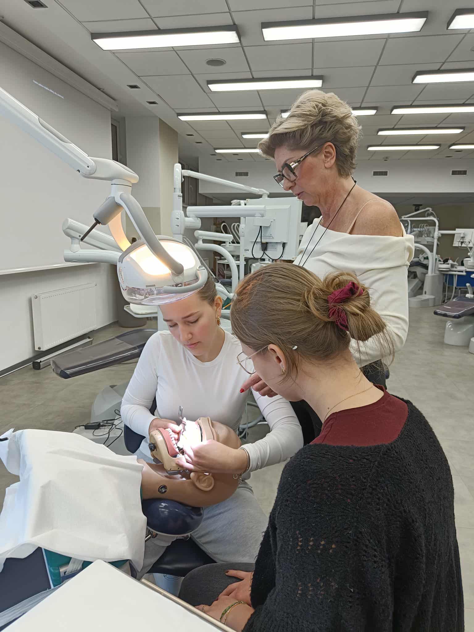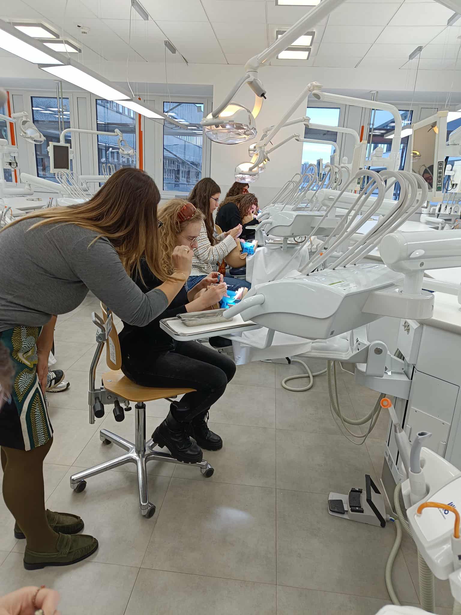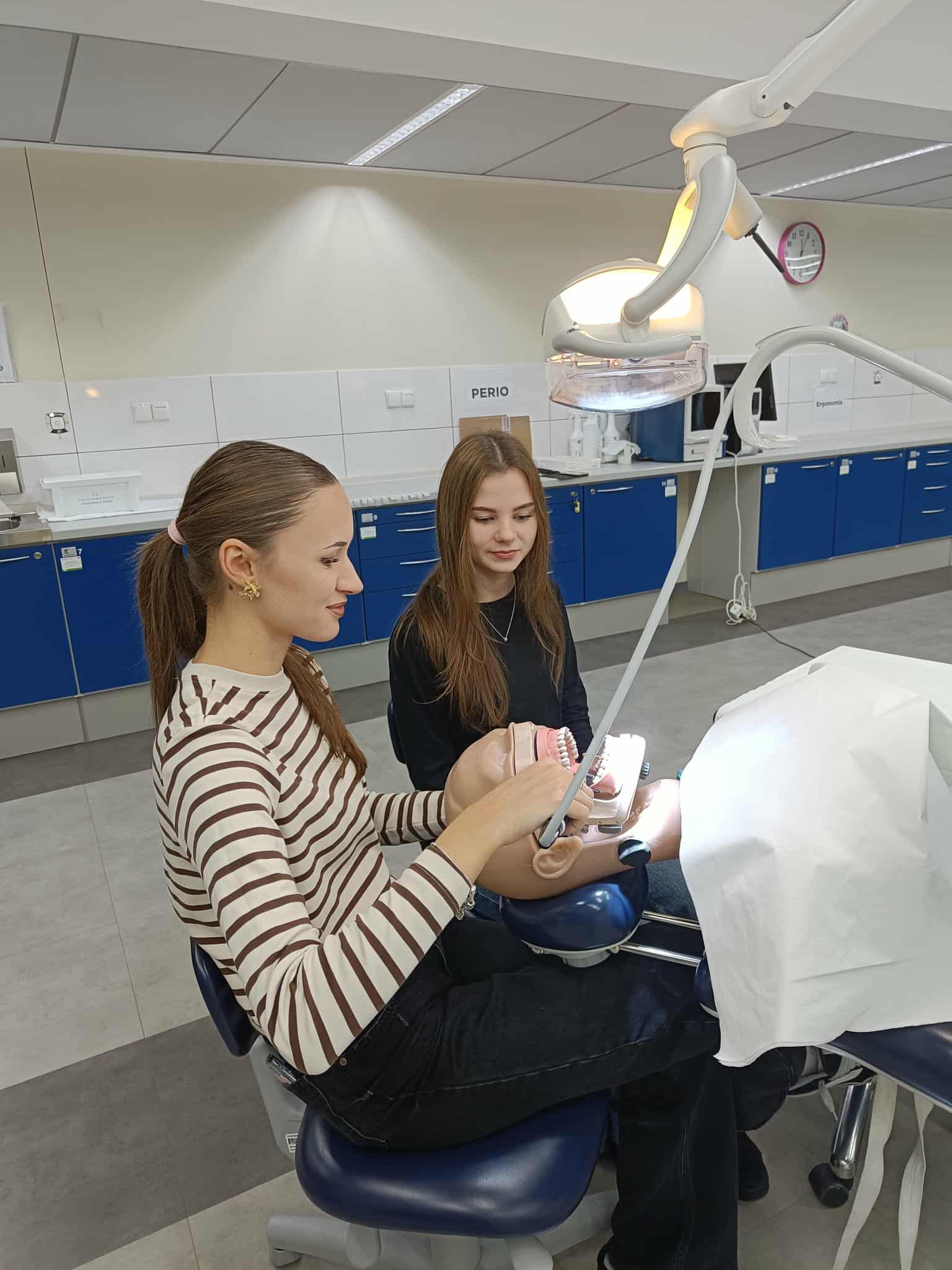 Uczniowie nie tylko zaglądali w głąb uśmiechu nauki, ale też samodzielnie wykonali wycisk szczęk, wyprofilowali zęba woskiem metodą kropelkową, zarobili masę wyciskową (nie, to nie była plastelina, a prawdziwy alginat) i nawet założyli plombę – na szczęście tylko ćwiczebną! Było dużo biologii, jeszcze więcej fizyki, a chemii… cóż, chemia między uczniami a stomatologią zdecydowanie zaiskrzyła.