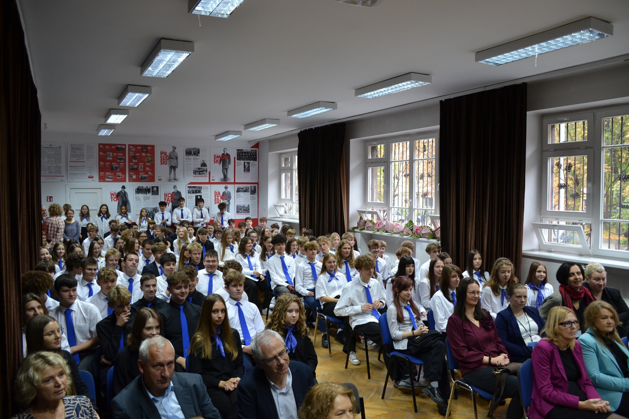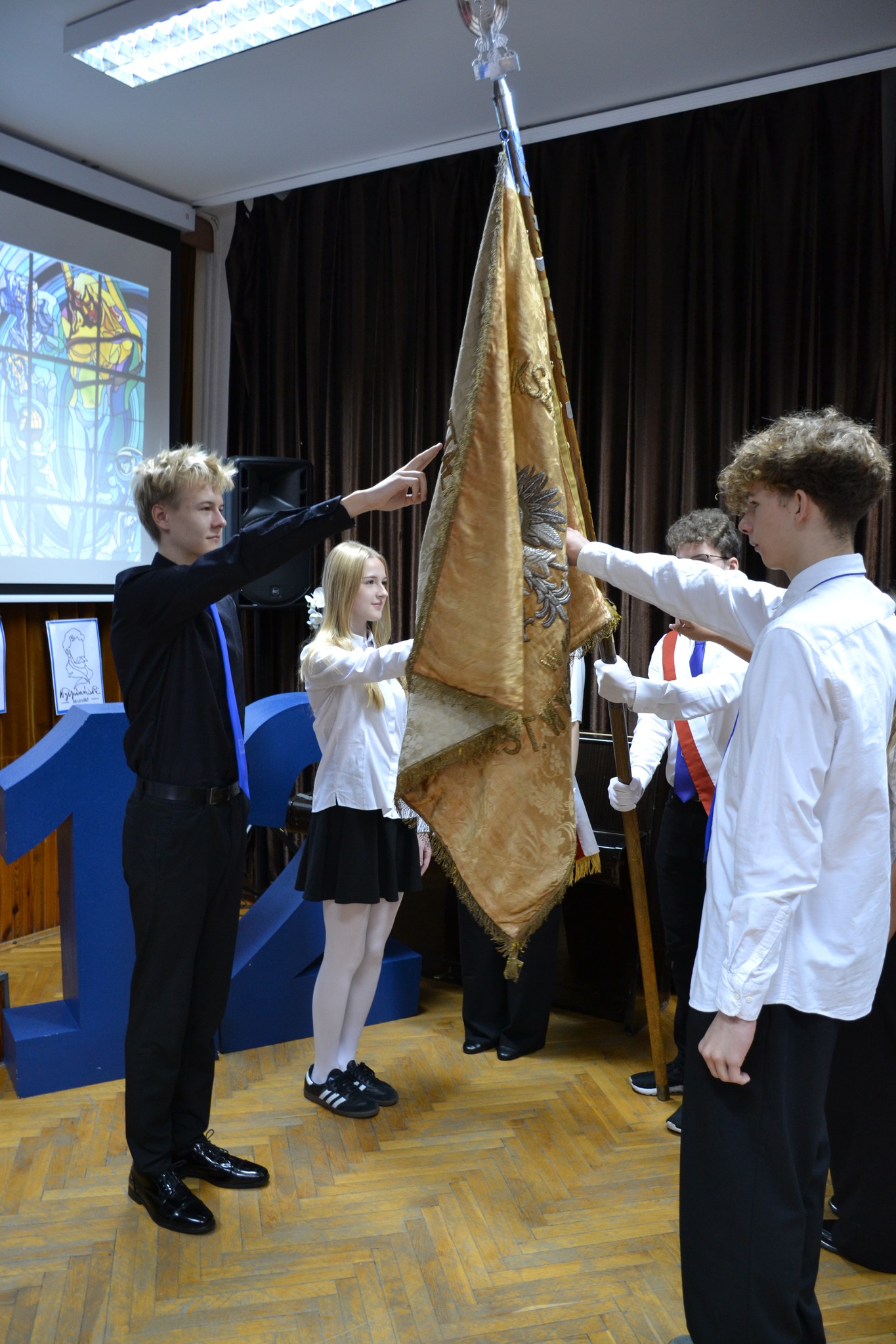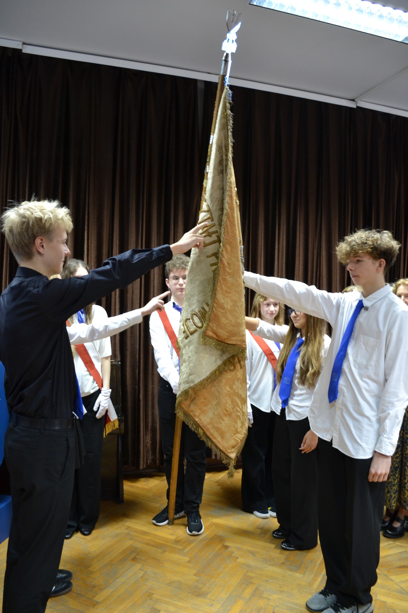 Oficjalna część obejmowała uroczyste ślubowanie na sztandar szkoły, przemówienie Pani Dyrektor Doroty Basny oraz wystąpienie nowo wybranego Prezydenta Rady Młodzieży Jana Majchrowskiego.
