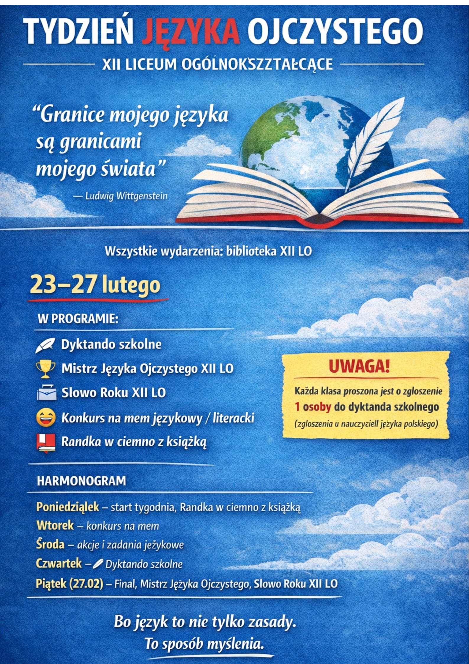 W dniach 23–27 lutego w naszym XII Liceum Ogólnokształcącym świętowaliśmy Tydzień Języka Ojczystego. Przez kilka dni szkolne korytarze wypełniły się słowami – tymi zapisanymi starannie w zeszytach, tymi czytanymi między okładkami książek i tymi wypowiadanymi z uśmiechem, czasem z lekkim drżeniem ręki nad kartką dyktanda.